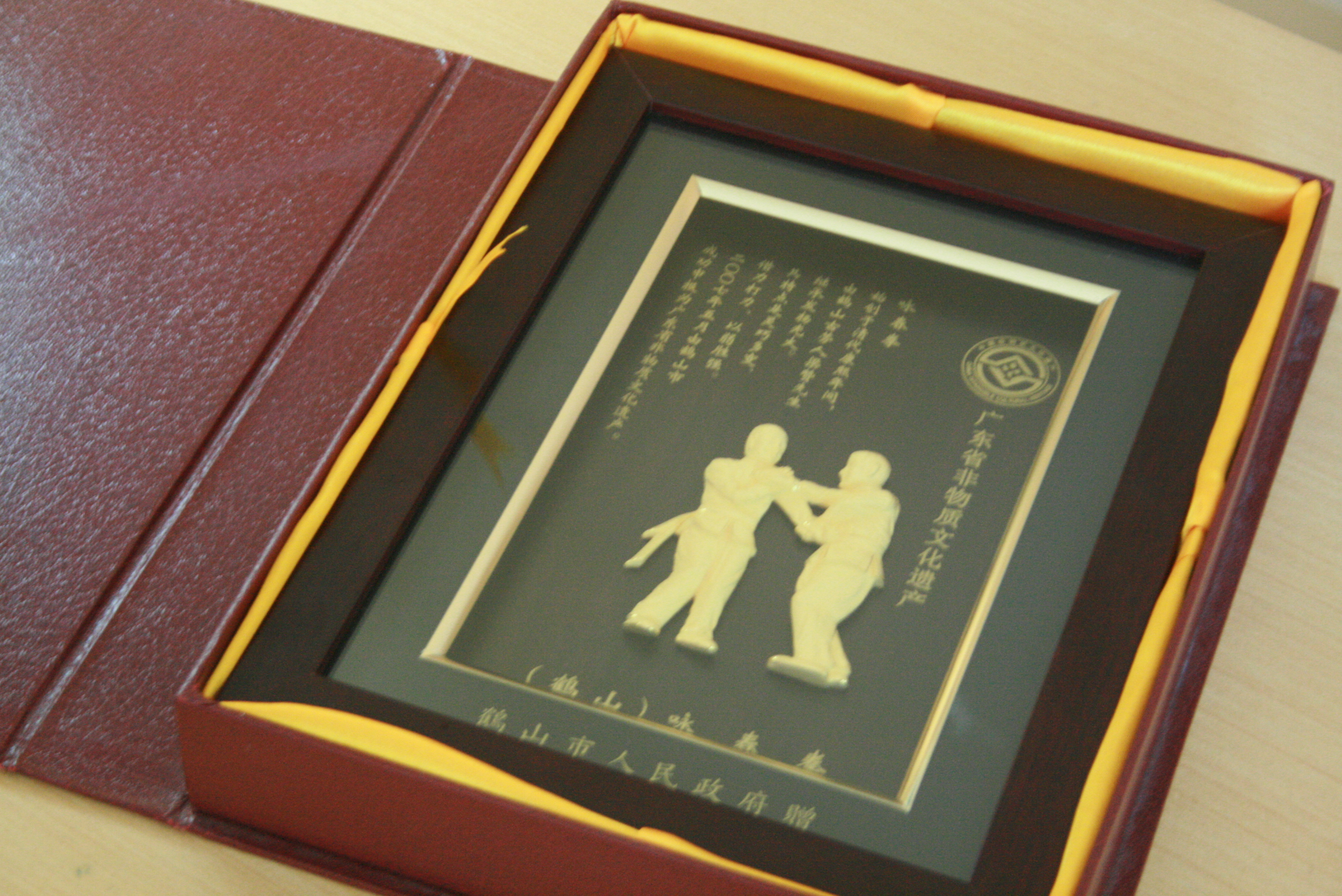 Placa do Governo Chinês reconhecendo o Ving Tsun como Patrimônio Cultural Intangível da Humanidade, sob a chancela da UNESCO.